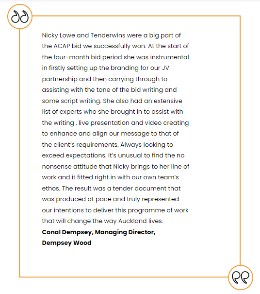Nicky Lowe and Tenderwins were a big part of the ACAP bid we successfully won. At the start of the four-month bid period she was instrumental in firstly setting up the branding for our JV partnership and then carrying through to assisting with the tone of the bid writing and some script writing. She also had an extensive list of experts who she brought in to assist with the writing , live presentation and video creating to enhance and align our message to that of the client’s requirements. Always looking to exceed expectations. It’s unusual to find the no nonsense attitude that Nicky brings to her line of work and it fitted right in with our own team’s ethos. The result was a tender document that was produced at pace and truly represented our intentions to deliver this programme of work that will change the way Auckland lives.
